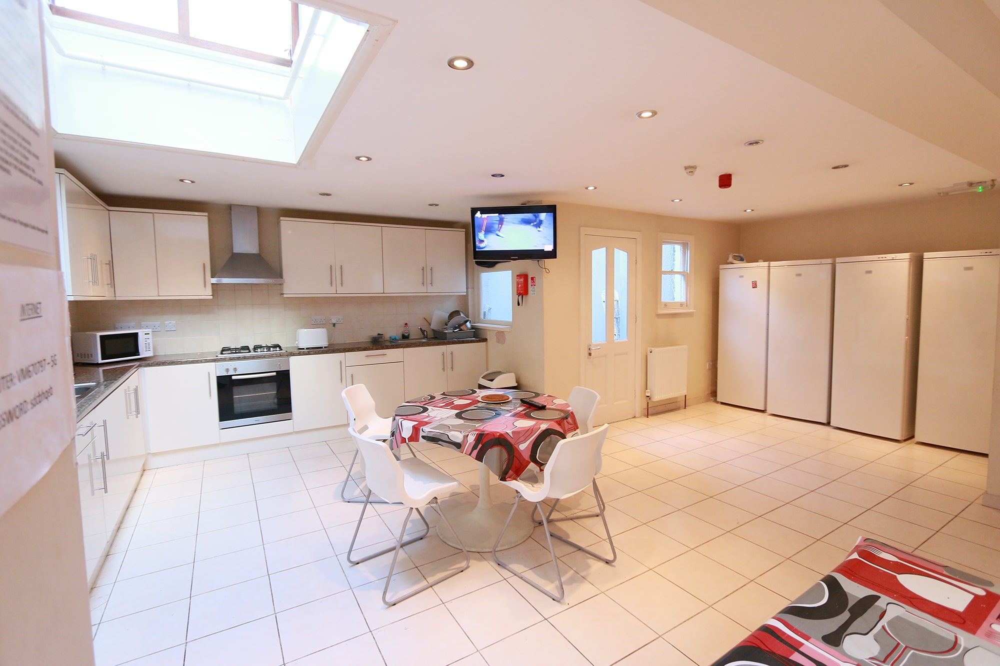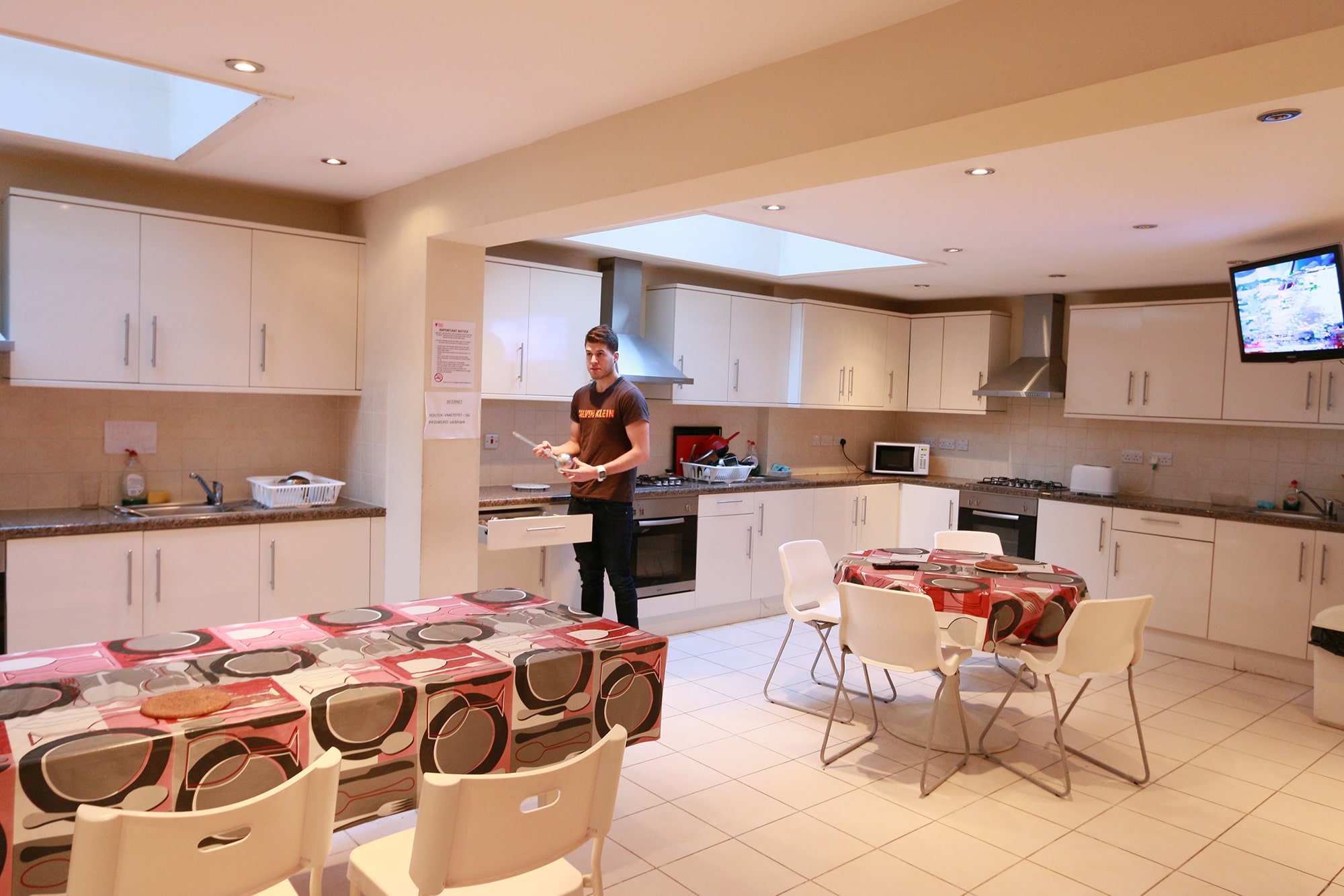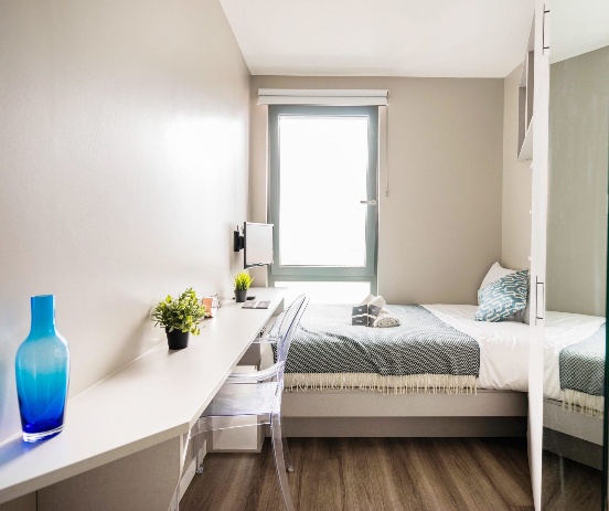 There are cluster flats of 2 en-suite rooms (with private bathroom) sharing a kitchen between 2 people or single studios. Both types of rooms are fully furnished with private bathroom, small double beds, TV screen, wardrobe with extra storage space and a desk with chair that is ideal for working from. The student residence offers a range of stunning communal areas such as: sauna & spa room, games room, Cinema room, library, secret garden, rooftop terrace, reception with lobby, study area and events space. There are 8 communal kitchens fully equipped and an onsite bar and restaurant.